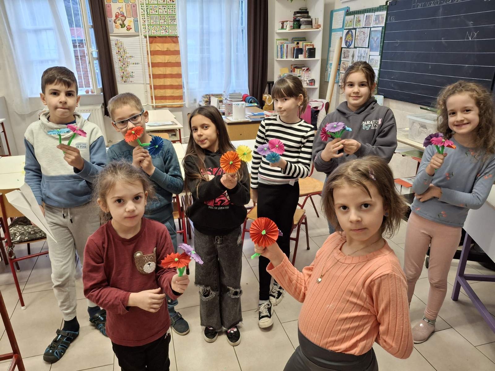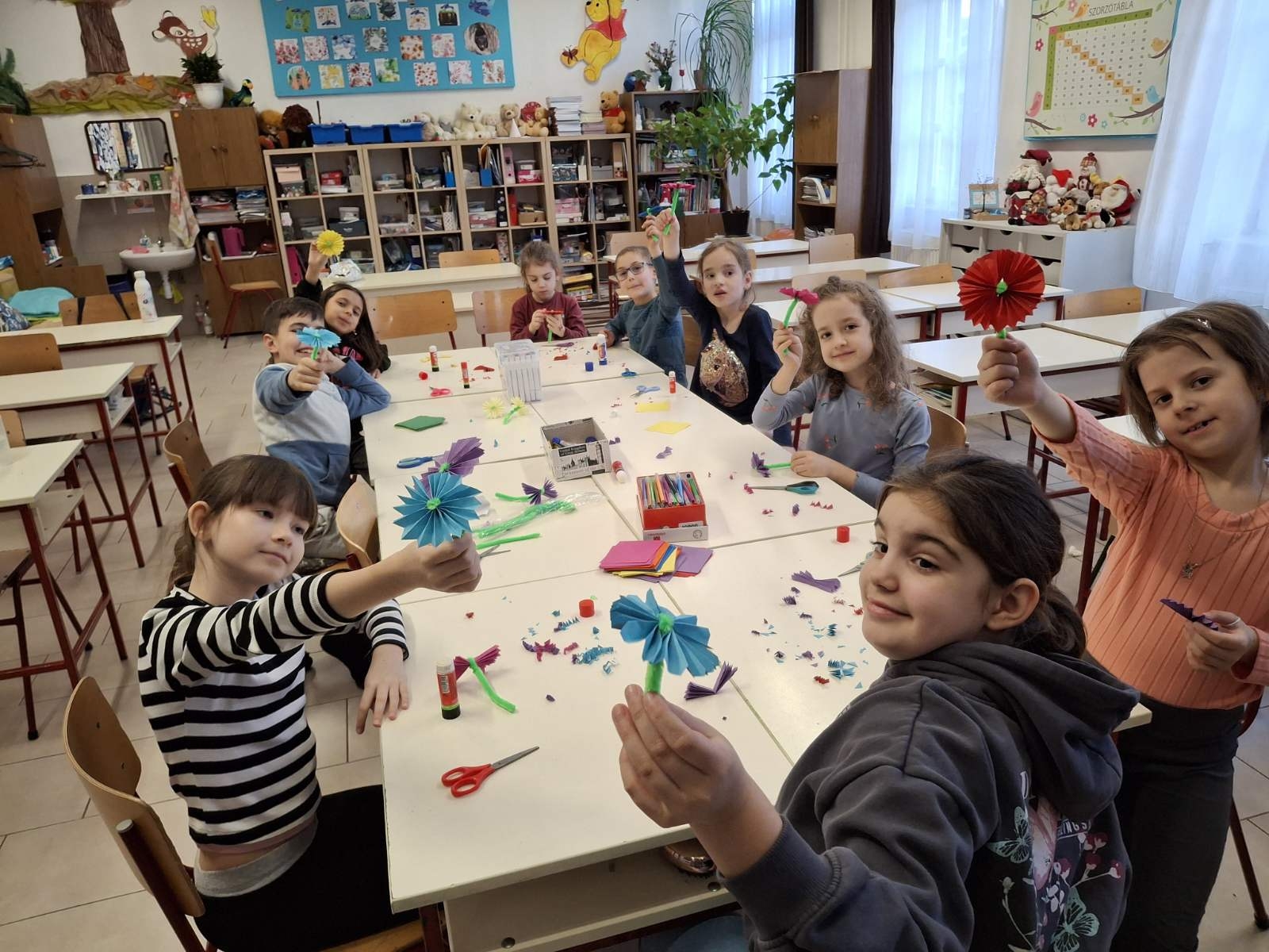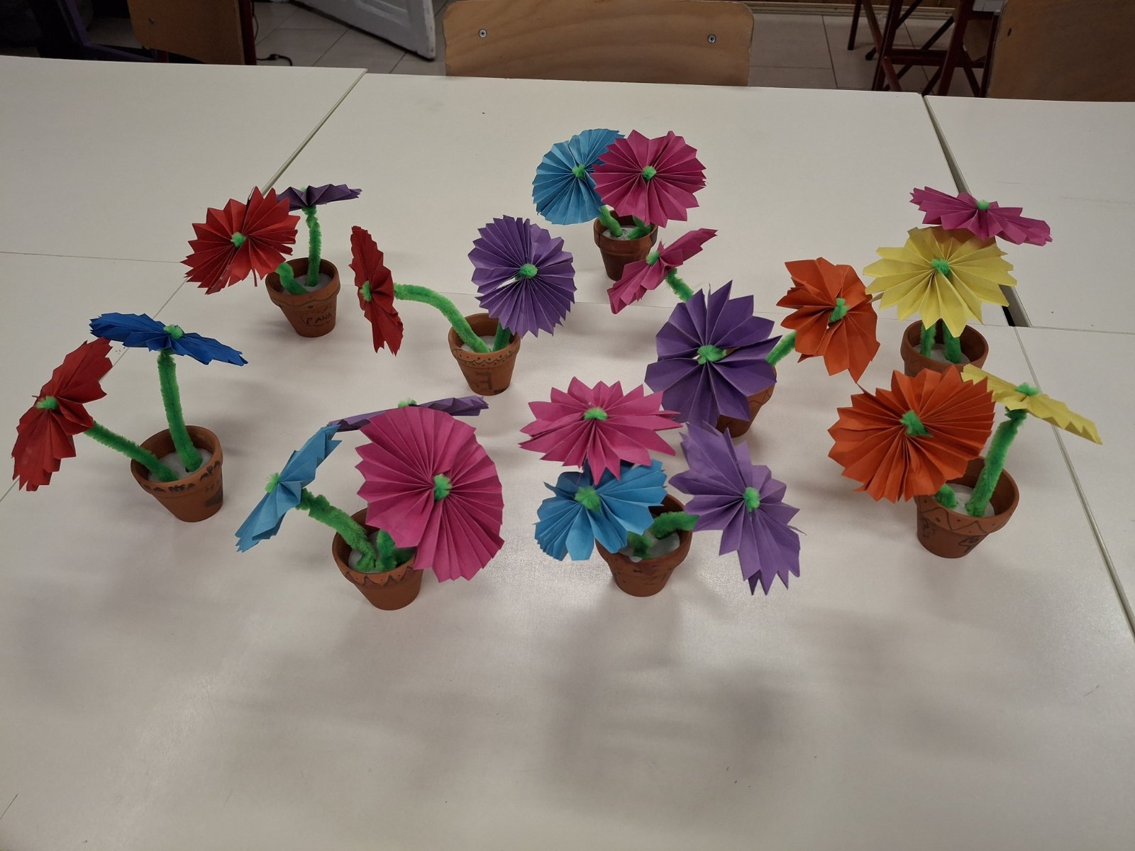 Ügyes kezek szakkörön kis cserepes virágot készítettünk hajtogatással, zseníliával.